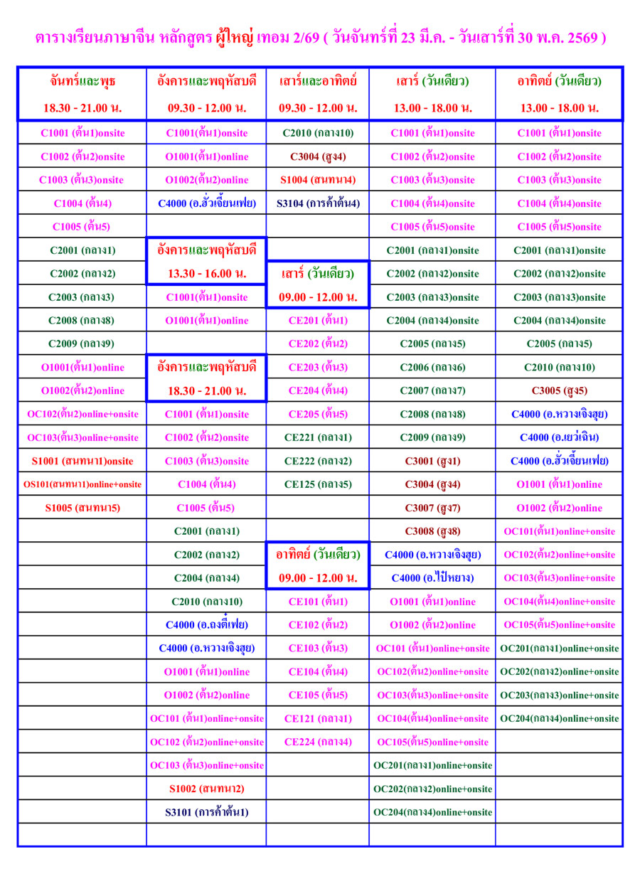ตารางเรียนภาษาจีน หลักสูตร ผู้ใหญ่ เทอม 2/69