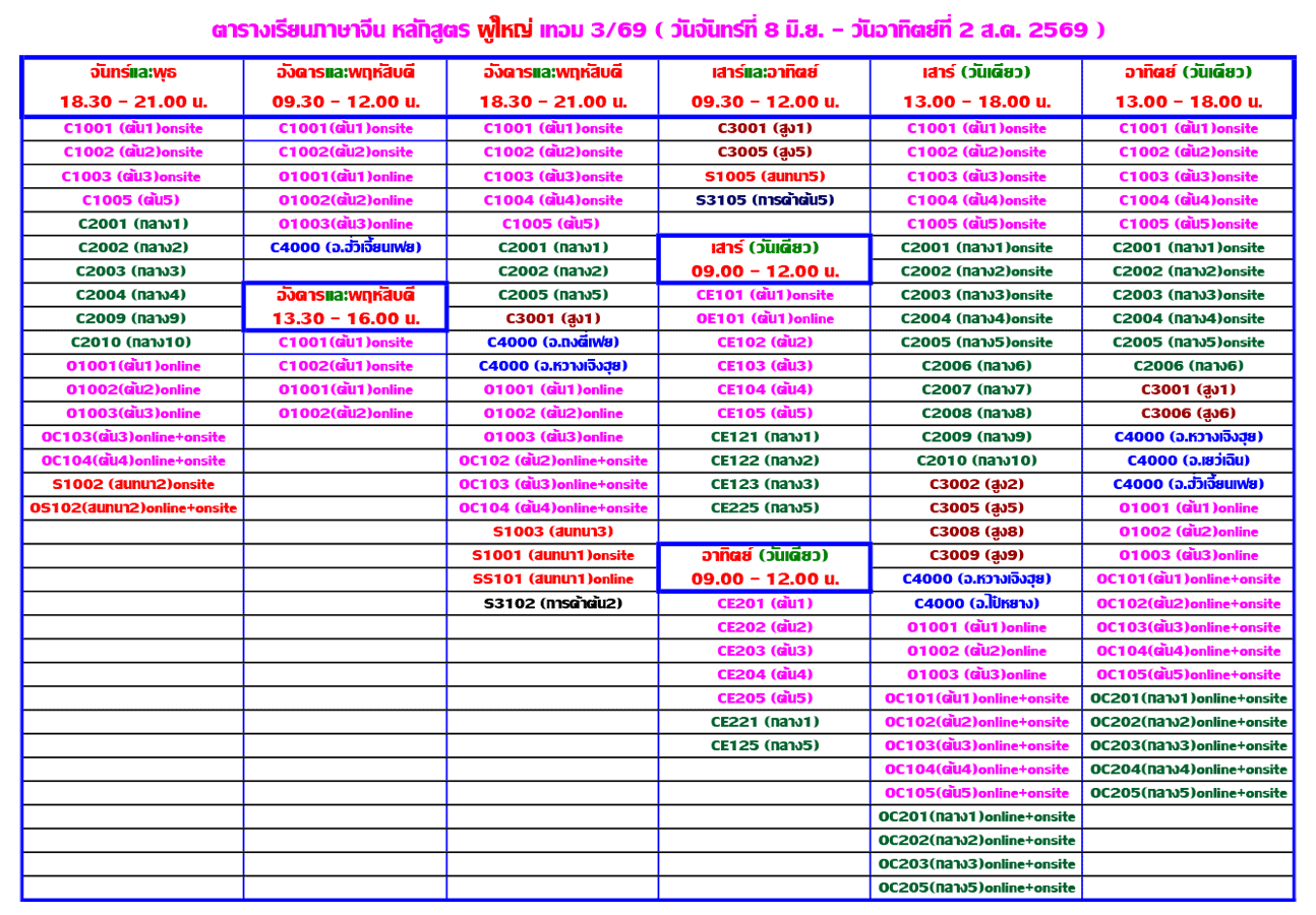 ตารางเรียนภาษาจีน หลักสูตร ผู้ใหญ่ เทอม 3/69