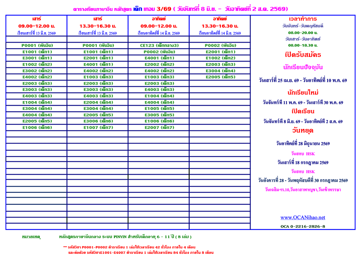 ตารางเรียนภาษาจีน หลักสูตร เด็ก เทอม 3/69