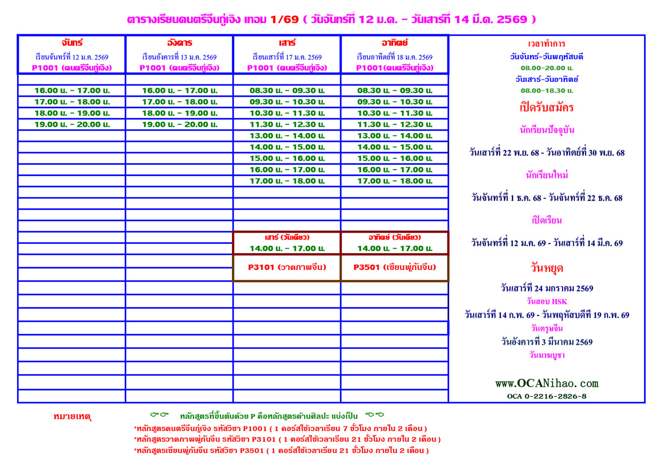 ตารางเรียนภาษาจีน หลักสูตร ผู้ใหญ่ เทอม 1/69