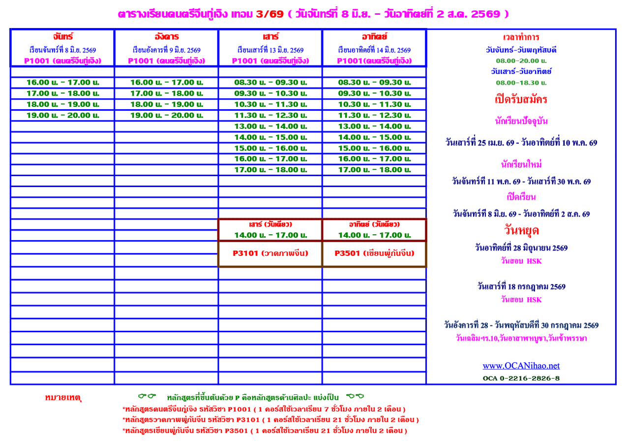 ตารางเรียนภาษาจีน หลักสูตร ผู้ใหญ่ เทอม 3/69